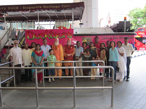 The photos above were taken aboard the "Duck Tours," a small fleet of amphibious boats which tour the streets of Singapore as well as the Marina Bay. The Singapore Mission members and students, who, you may guess, live in Singapore, had never been on the "Duck Tours" or visited the Marina Bay Sands SkyPark. They always look forward to these outings with Bodhinatha where they can be close to the Satguru for a few hours. From left to right, Dohadeva, Raman, Suselah, Nagavathy, Sivakumar, Easan, Shanmuganathaswami, Satguru Bodhinatha, Krishna, Sakuntalai, Sudha, Gopinath, Thivaashenee, Kasturi, Amar, Lavanya, Shanta Devi and Vasaant.