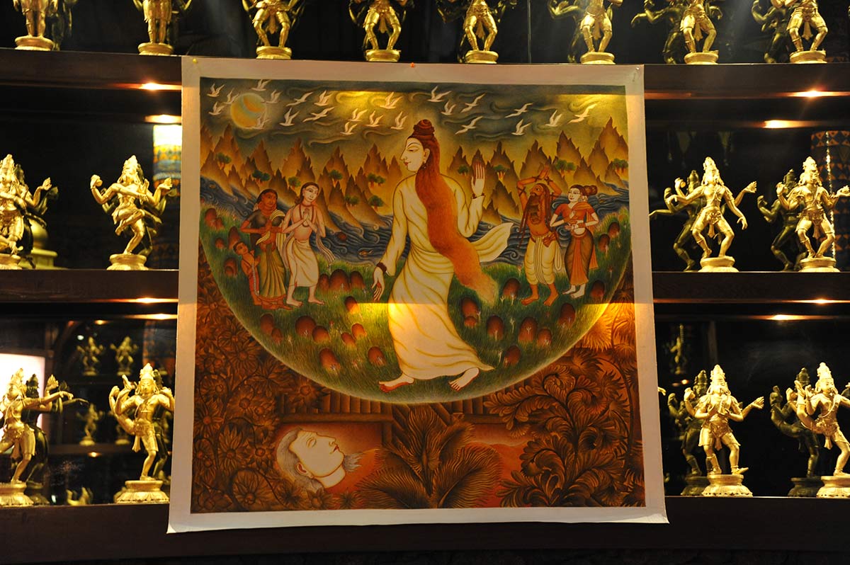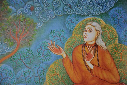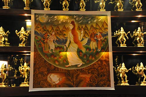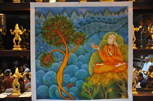 Two pieces of the Siva Darshana art have arrived from India and were hung in the temple for display this morning. Four feet wide and four feet tall, this is an artistic depiction of Gurudeva sitting out on San Marga, where, on a totally still day, a small tree rustles to draw his attention.