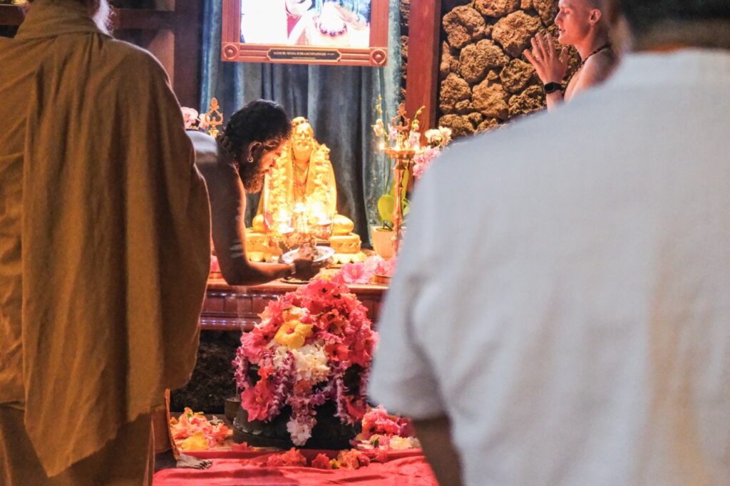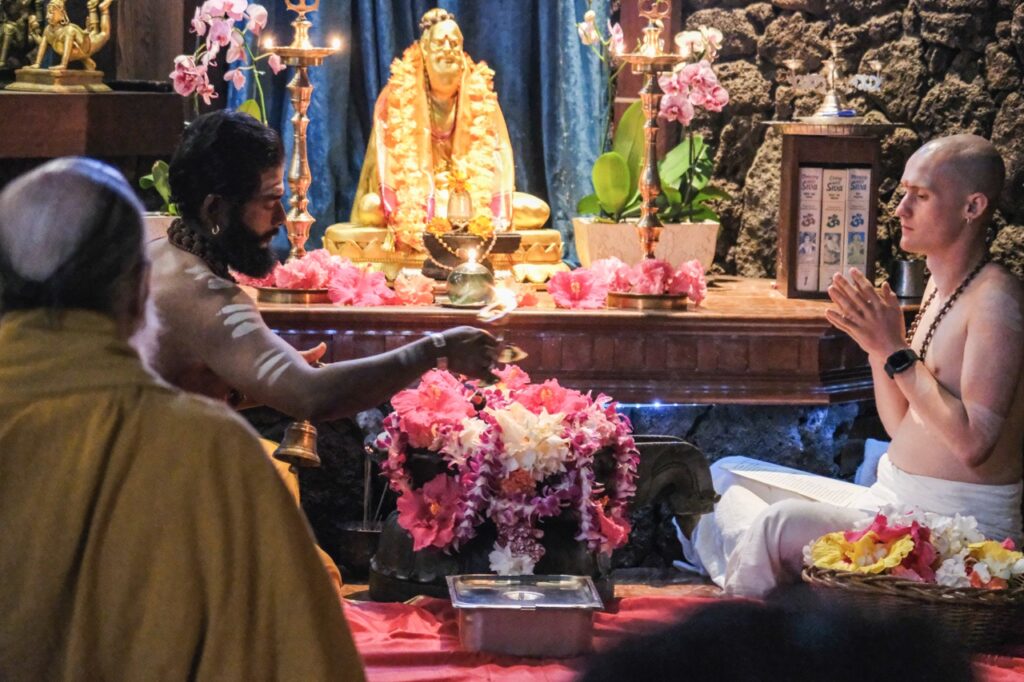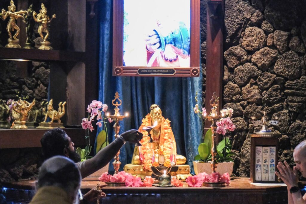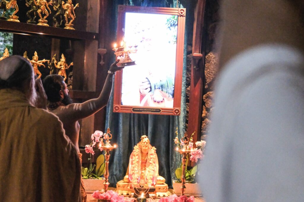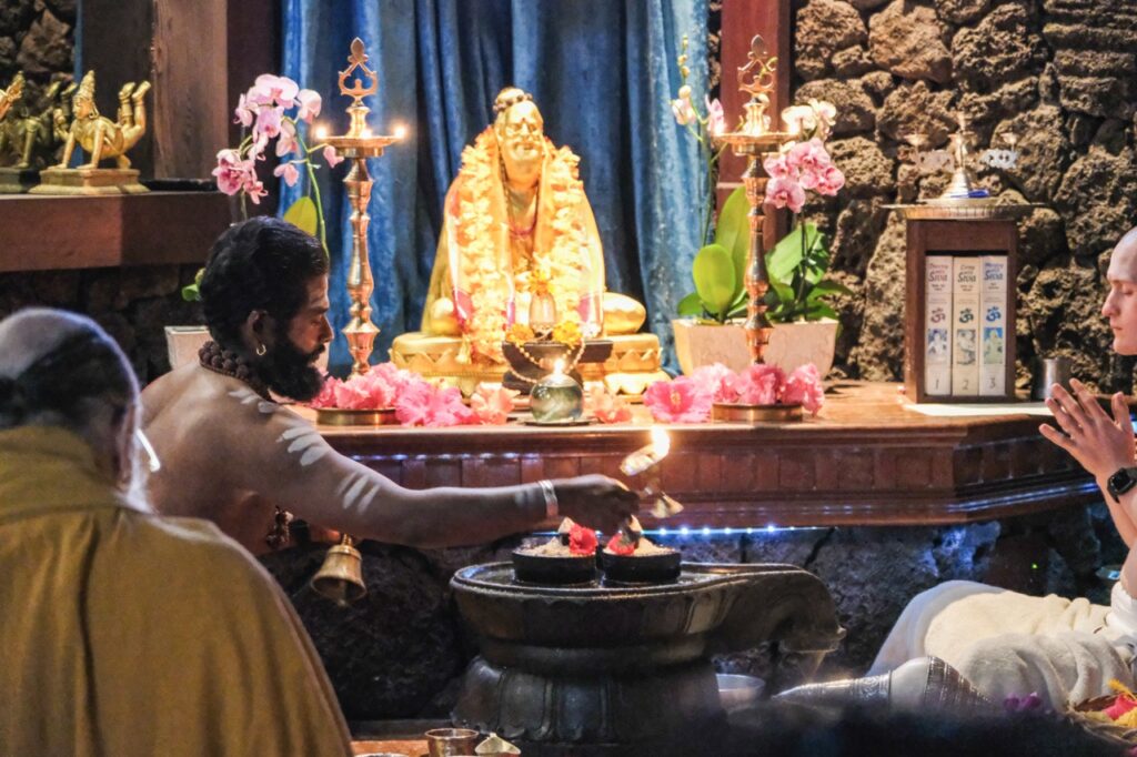Last night, Iraivan Temple came alive with the radiant celebration of Sivalaya Dipam, a sacred festival honoring Lord Siva as the infinite light of consciousness. This festival commemorates Lord Siva’s boundless nature as an endless pillar of light. Devotees gathered at sunset for the enchanting ceremony. A collection of oil lamps encircled the temple sanctum, casting a serene glow. After a puja to Mahalingesvara, the flame was carried by Satguru out to the front of the temple. The event culminated in the lighting of a grand fire in front of Iraivan, mirroring the traditional hilltop beacon lit at Mount Arunachala in Tamil Nadu.