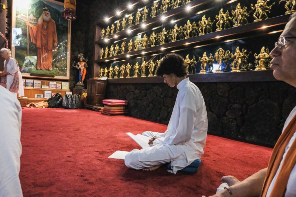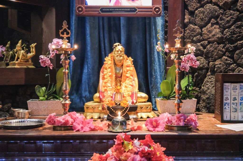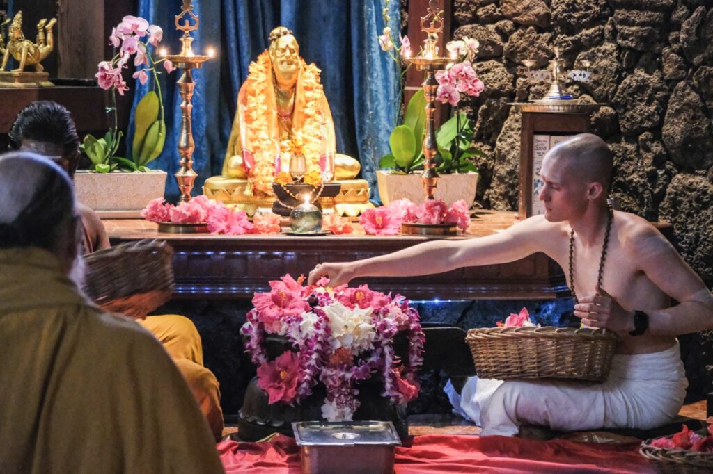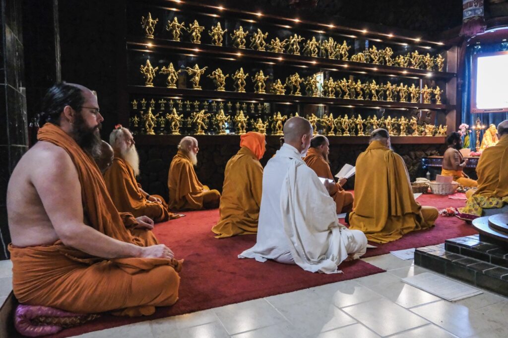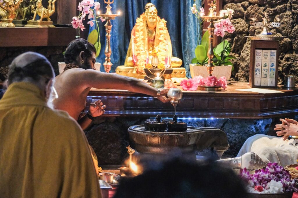 Last night, Iraivan Temple came alive with the radiant celebration of Sivalaya Dipam, a sacred festival honoring Lord Siva as the infinite light of consciousness. This festival commemorates Lord Siva’s boundless nature as an endless pillar of light. Devotees gathered at sunset for the enchanting ceremony. A collection of oil lamps encircled the temple sanctum, casting a serene glow. After a puja to Mahalingesvara, the flame was carried by Satguru out to the front of the temple. The event culminated in the lighting of a grand fire in front of Iraivan, mirroring the traditional hilltop beacon lit at Mount Arunachala in Tamil Nadu.
