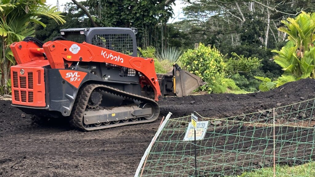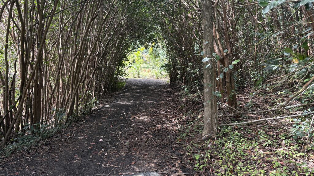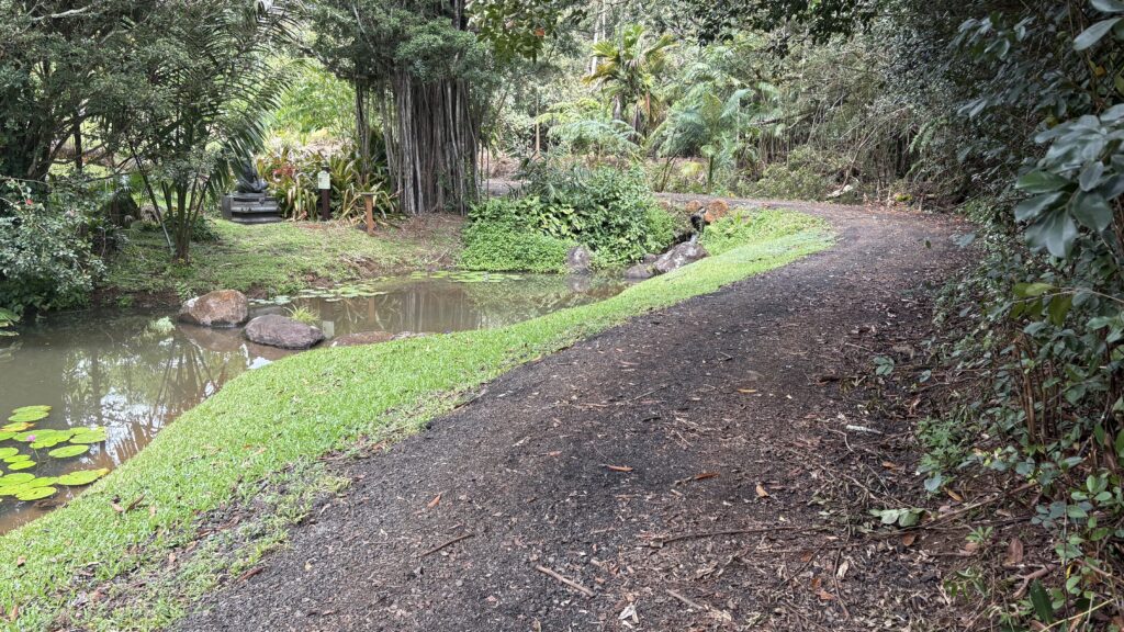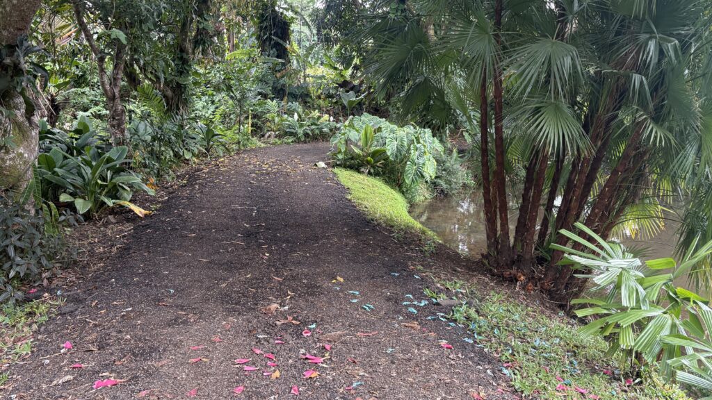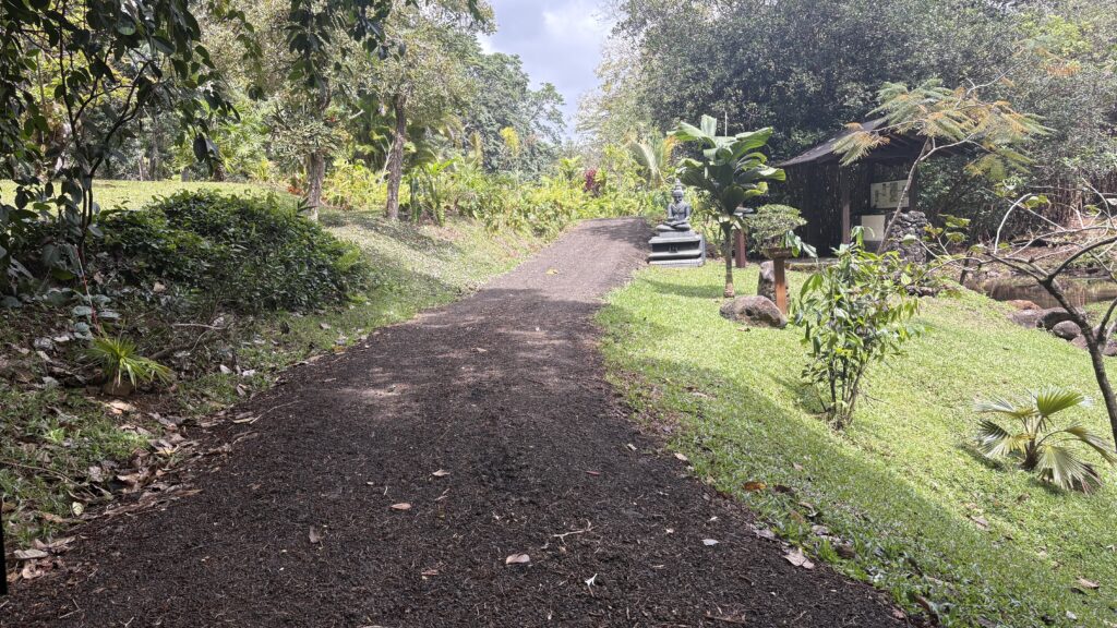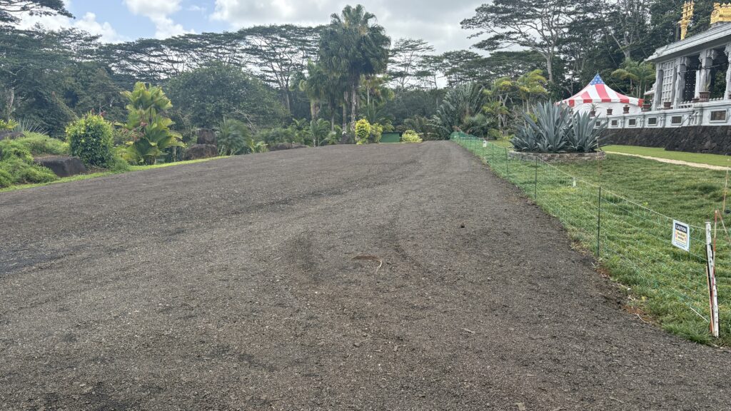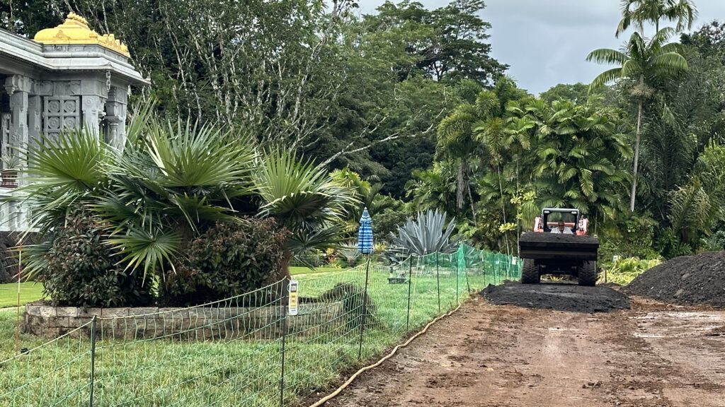 Paths and roads have been the great enablers for the Romans, the Vedic explorers, the early American pioneers, indeed all who wanted to go more than a hundred feet in a day. And the evolution from cow path, to walking trail, to dirt road to paved highway has marked mankind’s progress. So it will surprise no one that paths at the monastery are similarly evolving. For decades we had unimproved dirt paths and roads. A few years back we were able to upgrade a the major arteries, but until recently most access around the land (and visitor parking) was on unimproved dirt, often pitted with potholes that filled with water and mud whenever it rained, which is often as you know.