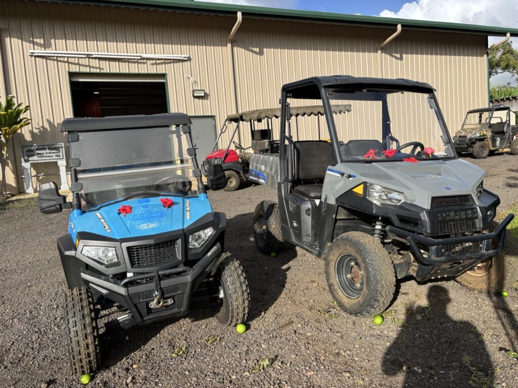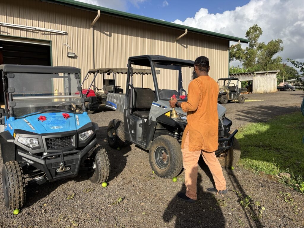 As some may know, care for the Aadheenam’s vast acreage is greatly assisted by our small fleet of mostly electric utility vehicles. These little machines are used for everything from gardening and hauling tools to showing around special guests and providing simple, quick transport from A to B. These vehicles are in constant use, and at times we don’t have enough available for all the countless projects taking place. Thankfully, we recently acquired two new additions. The smaller blue one is in great condition and was offered to the monastery at a very low price, while the larger one was a gift. It had stopped working, and its owner said we could have it. Our monks quickly fixed a tiny problem and had it running again like new.