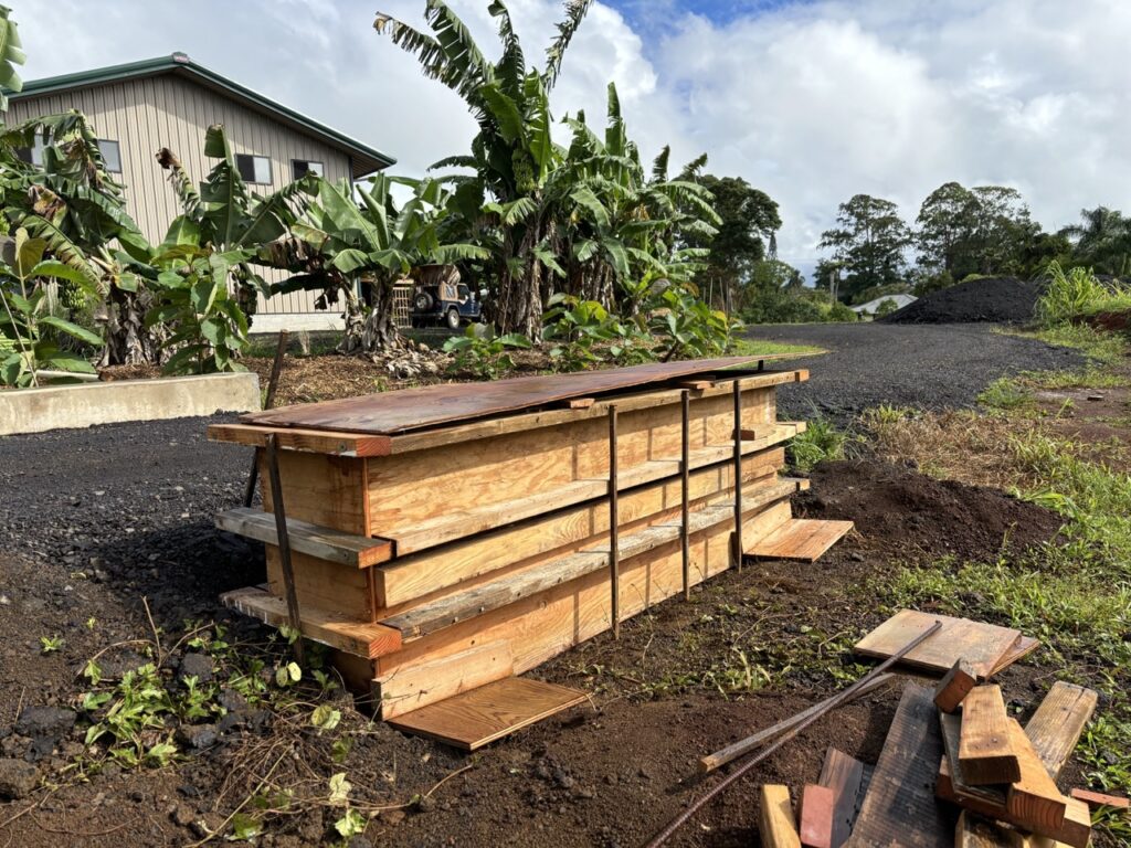 The heavily used back road going towards the new Siddhidata Kulam building has a culvert to channel downslope rainwater. It’s easy for gravel and debris to be pushed off the road and start blocking the culvert. To prevent this, and also for the safety of vehicles crossing the narrow space, a thick cement barricade was created on the edge. The other side is being prepared for the same.