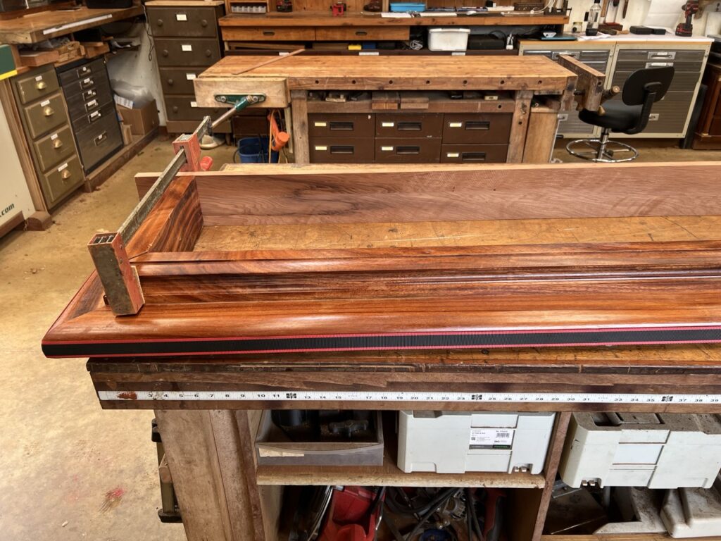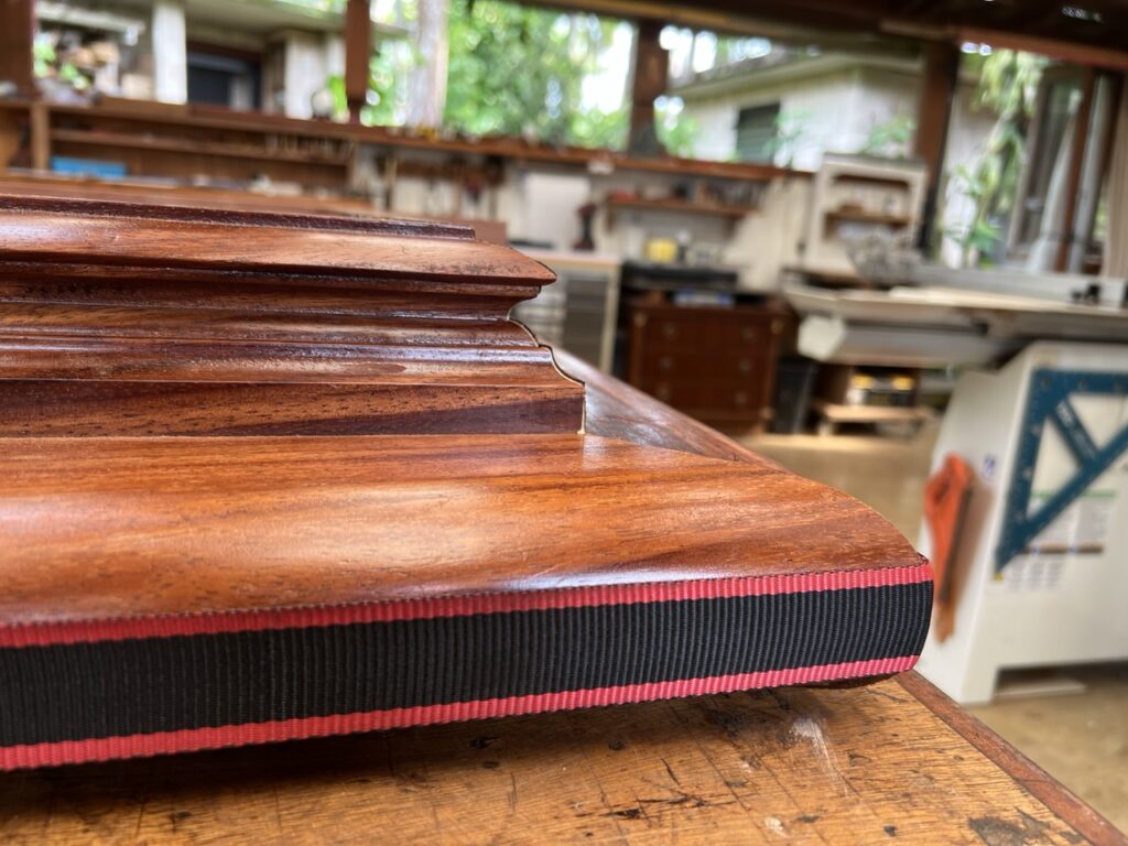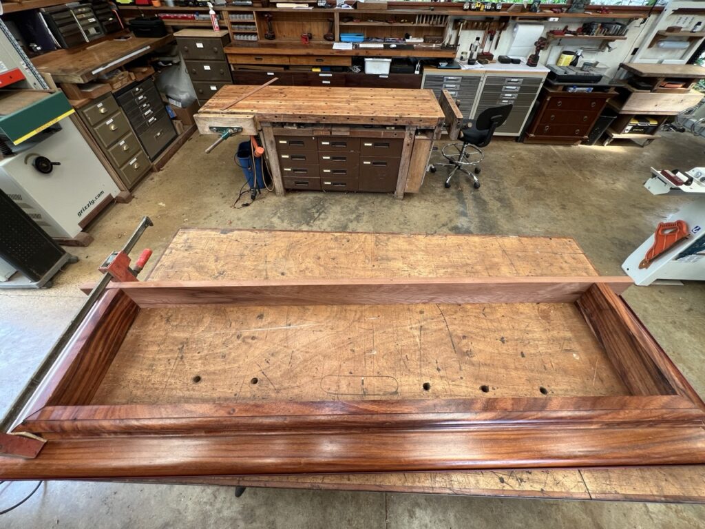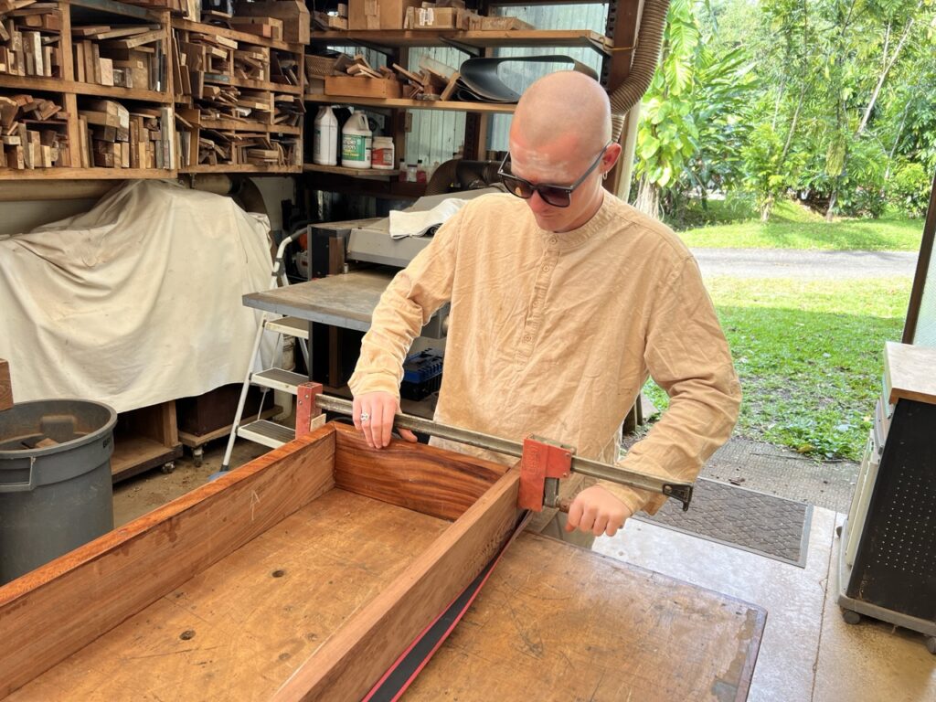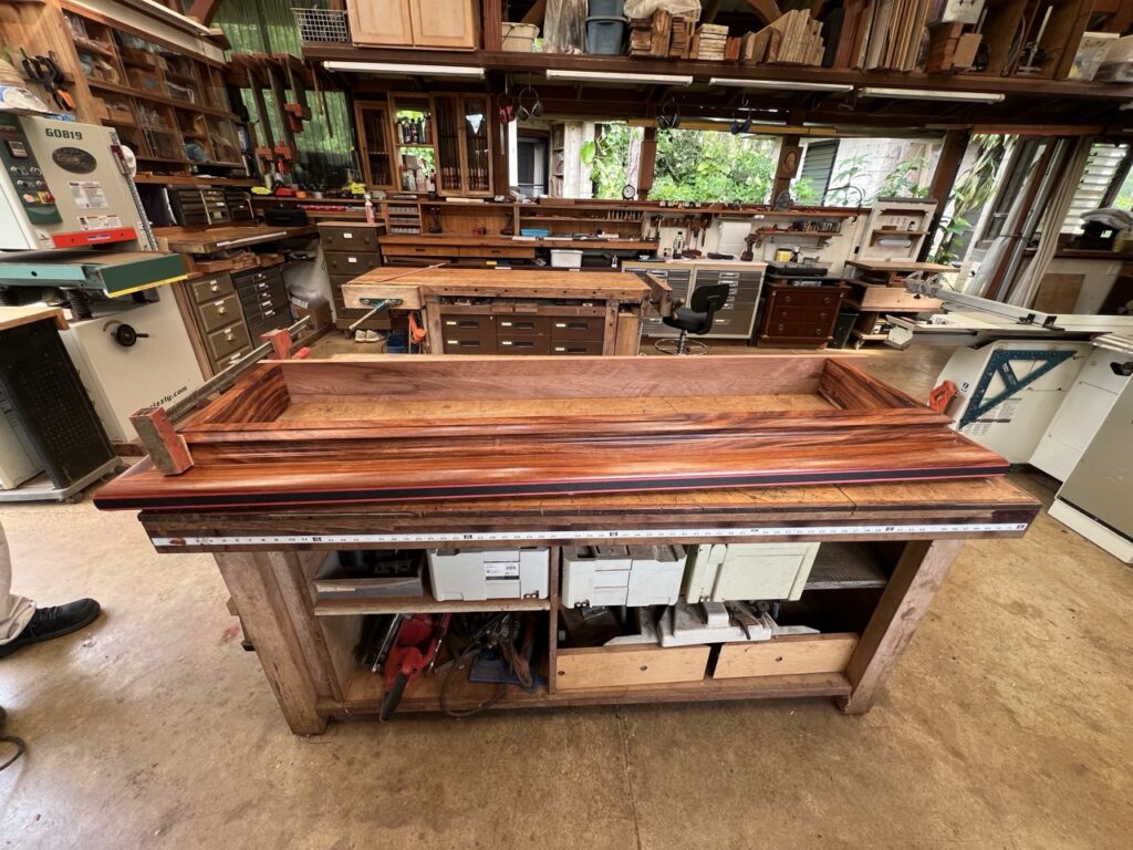 The Siddhidata Kulam has been working on completing the fish tank’s cap, and it has now reached the final stage. Sadhaka Shankaranatha, one of the members of the Siddhidata Kulam involved in this project, is carefully putting the pieces together by gluing them and ensuring they hold firmly in place. After this, it will need a bit more sanding and polishing, and then it will be ready to be placed on top of the fish tank.