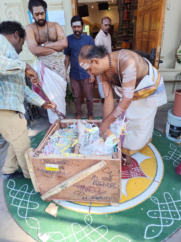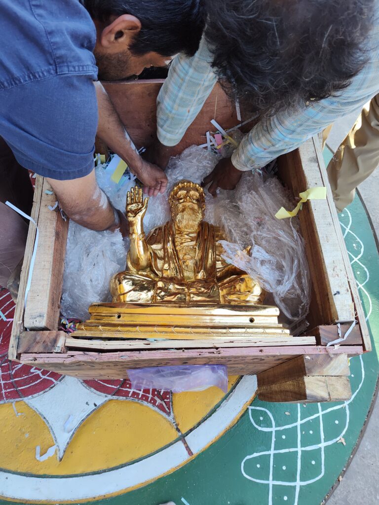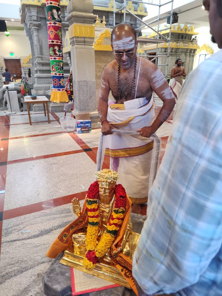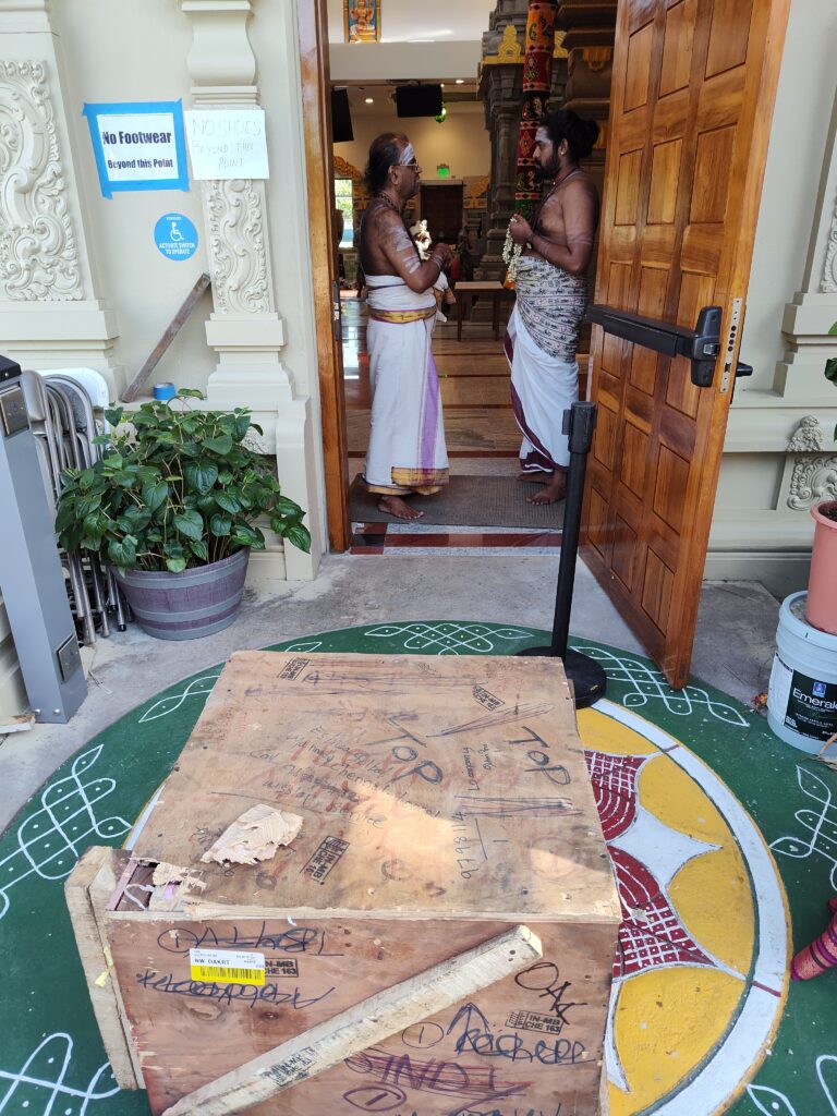 Everyone rushed to meet the deadline. The timing was not what was planned; it was better. The original schedule had the arrival scheduled to coincide with the May 9-10 kumbhabishekam, the Grand Opening. But the shipment was delayed and it arrived weeks later. This was great, because all of the intensity of 50,000 devotees, and all of the sacred chaos had settled, so when Gurudeva arrived the temple was quiet and the priests could focus solely on taking care of him. The slideshow shows the simple greeting. At a time yet unknown to us Gurudeva will be moved to his permanent place and be installed.