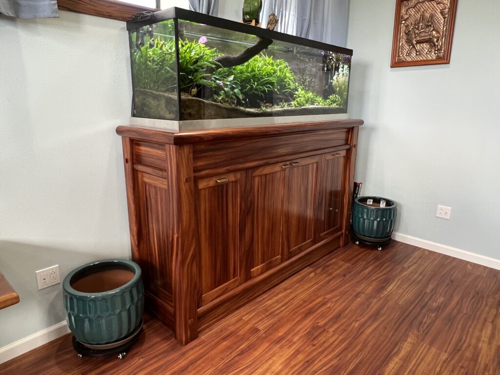 Over the past six months, Acharya Kumarnathaswami and Sadhaka Shankaranatha have been crafting wooden cladding to go around the existing fish tank frame in the Hale Hana office space. They used ear pod wood grown on the island, which had been chainsaw-milled many years ago and left to dry in our sawmill. This was the monks’ first time working with this lumber.