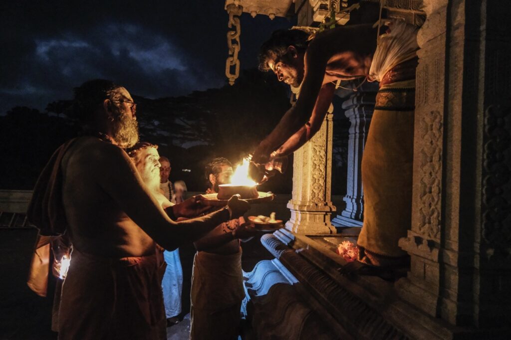 The monks rise long before dawn. At 4:00 a.m. they bathe and enter into silence. Each performs private japa and meditation in his hut before gathering at 5:30 for the early-morning puja in Kadavul Temple. There, flames of camphor flicker in the dark and bells ring through the halls as Sanskrit mantras and offerings are made to Lord Siva.