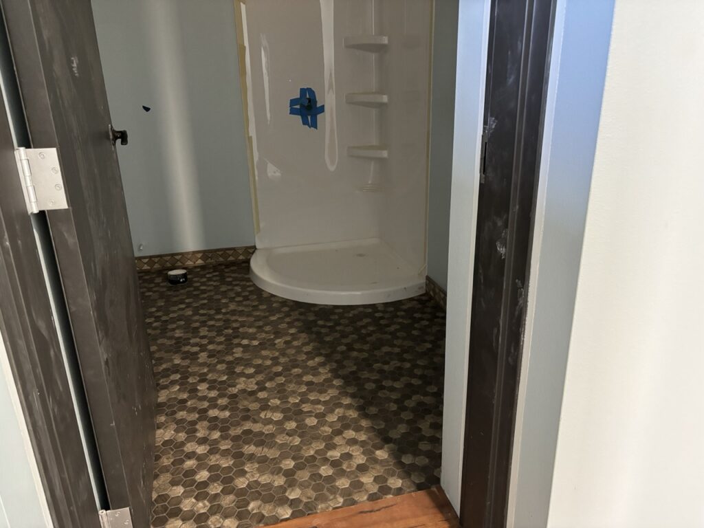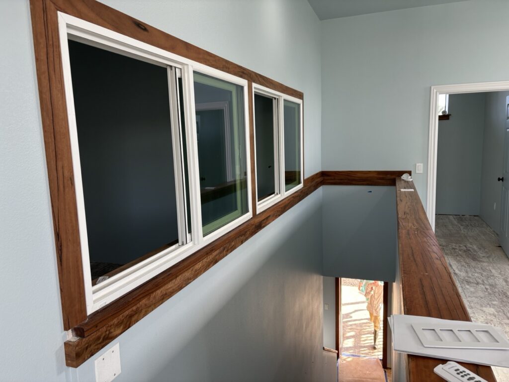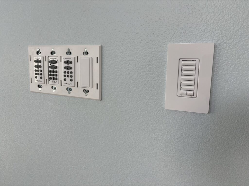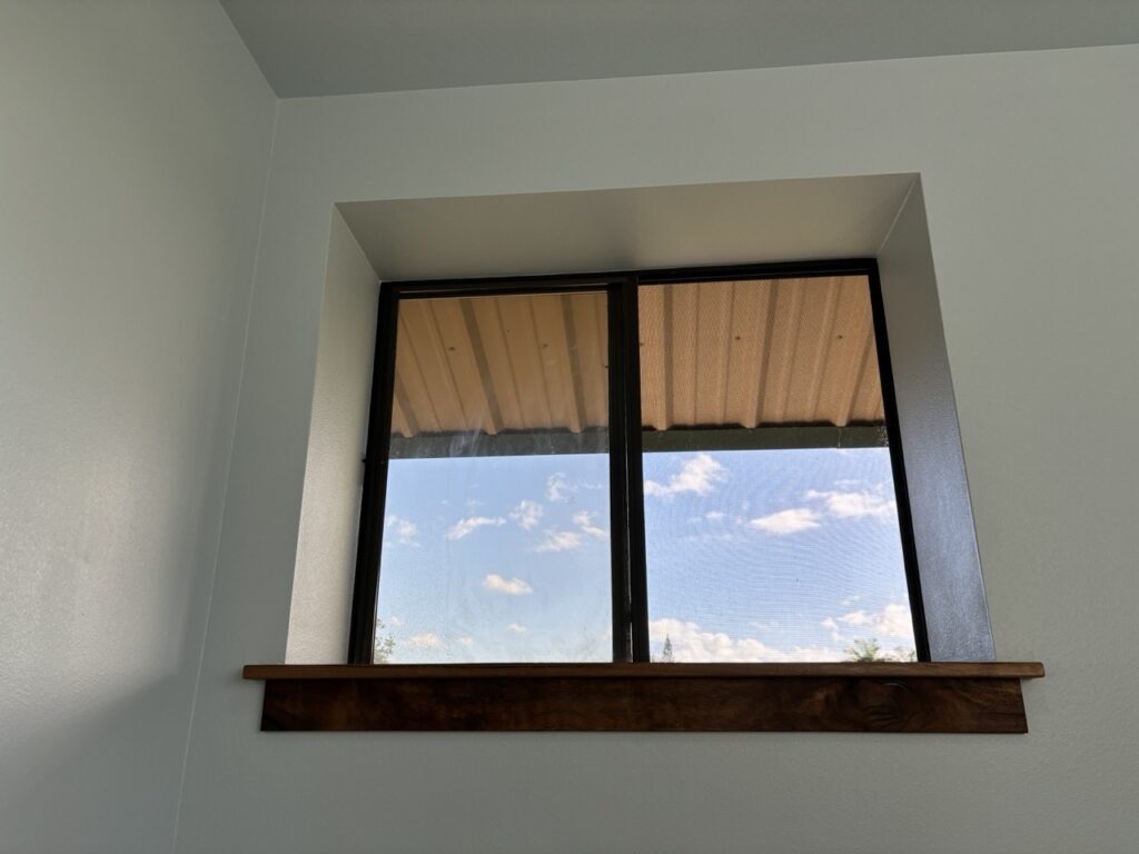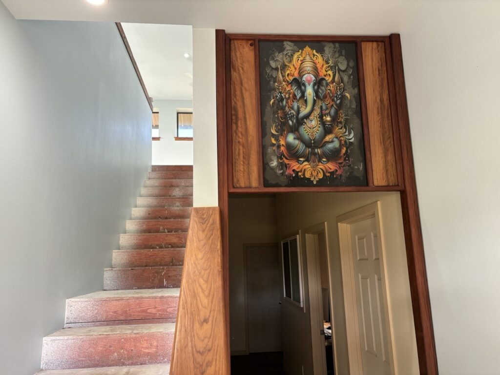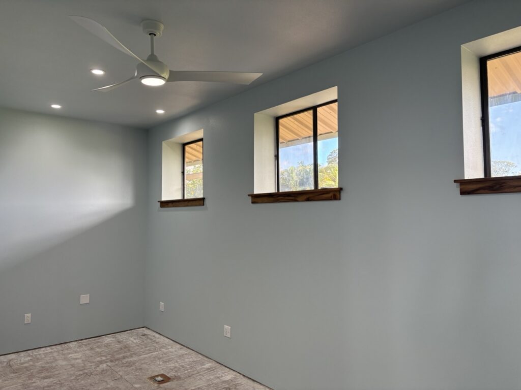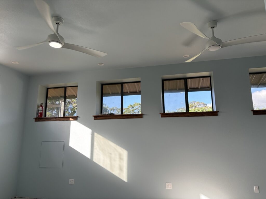 Over the last few weeks, the upstairs of Hale Hana building saw more stages of construction completed. A worker came to tile the shower room floor. Another painted all the walls a pale blue. The Siddhidata Kulam members installed wood window sills and trim in all the rooms. And over the last week, sishya Easvan Param was here to oversee the installation of fans, switches, power outlets and a Lutron control system for all the lighting.