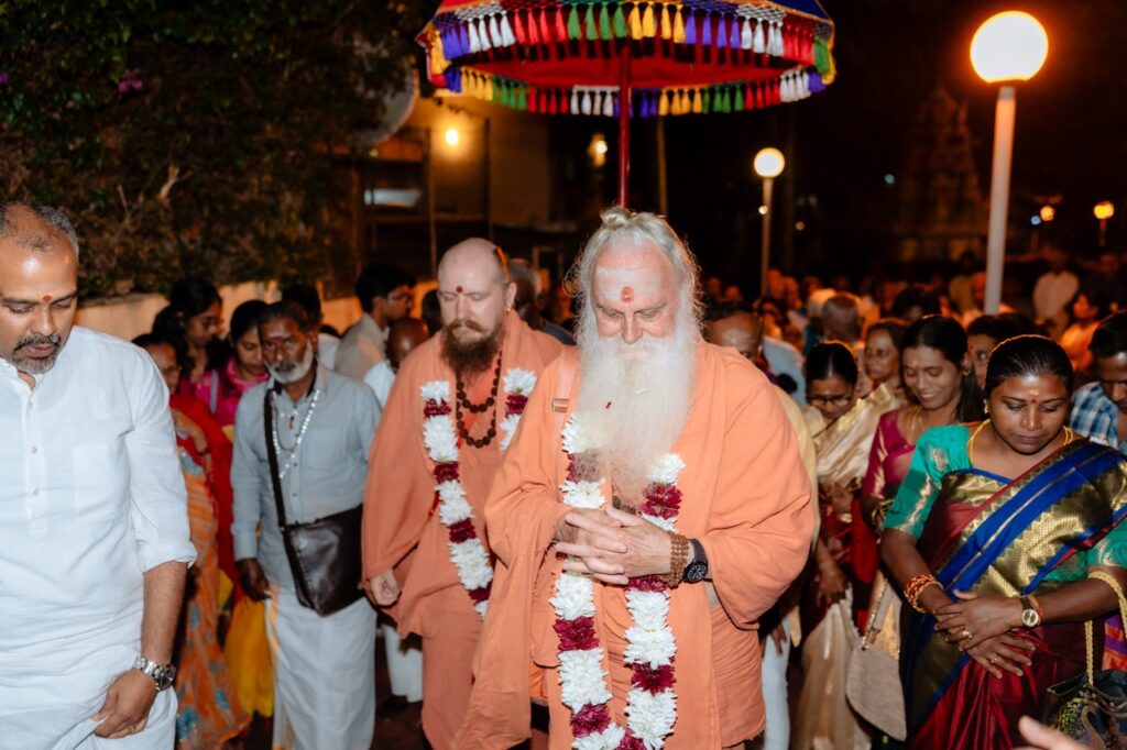 Recently while in Mauritius, Paramacharya Sadasivanathaswami and Sannyasin Tillainathaswami traveled to Quatre Bornes for an evening event at the Mayil Kovil there, which resides upon the nearby Corps-de-Garde hillside. Arriving in the evening, our swamis led the march up the nearly 300 steps stairway to the temple. Several hundred people were in attendance. After being greeted by the resident Shivacharya, the group circumambulated the temple and then stepped inside for worship at the main shrines, concluding with an arati to Lord Murugan. Paramacharya was then asked to give an upadesha to everyone. He discussed many of the joys and strengths of Hinduism, as well as provided advice for handling the encroachment from other religions, while including some stories about the advice that Gurudeva had given many years ago to crowds in Sri Lanka. Aum.