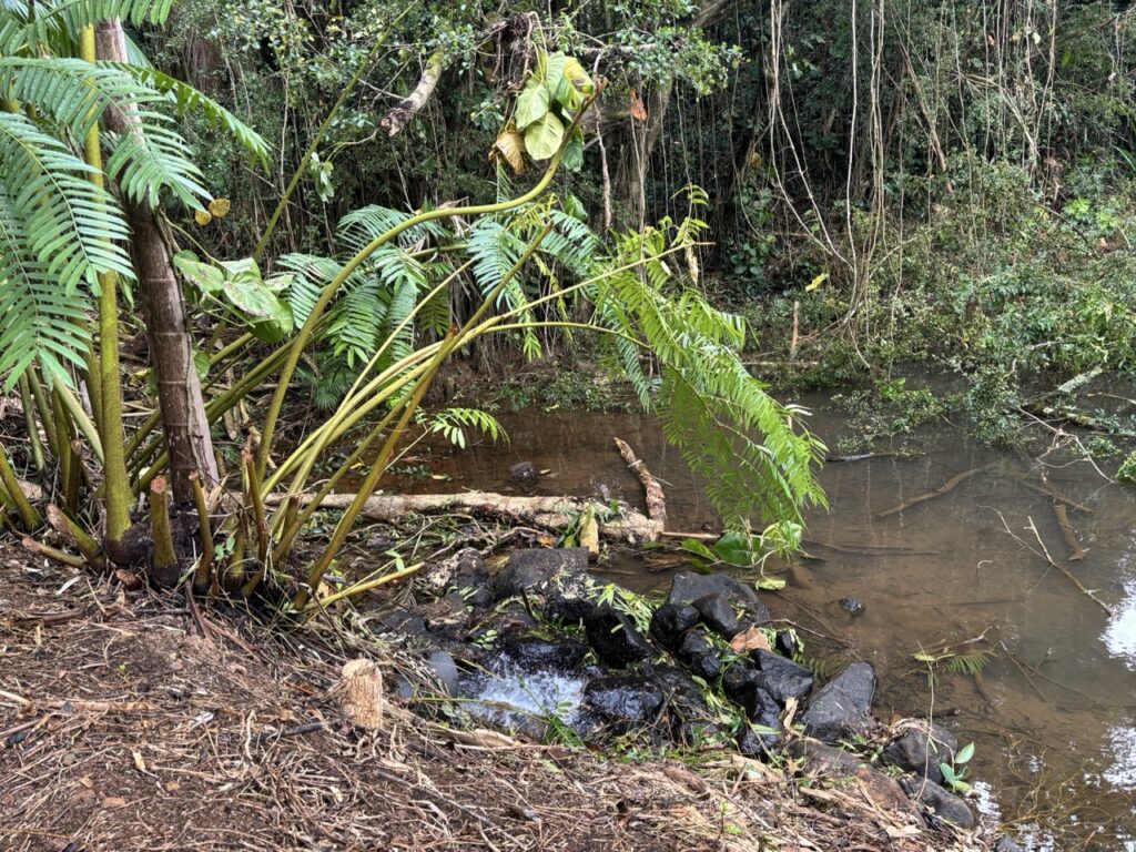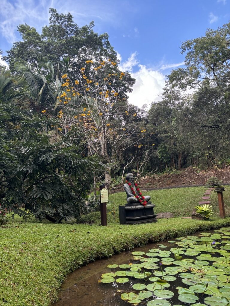 An employee is gradually clearing the brush from the area, so visitors can once again view the banyan tree charmingly sending roots down into the pond, the large Australian Tree Ferns on the isthmus and a small waterfall exiting a culvert underneath, while listening to bird chirps and the gurgle of moving water. One of many pristine pilgrim-accessible areas of our grounds.