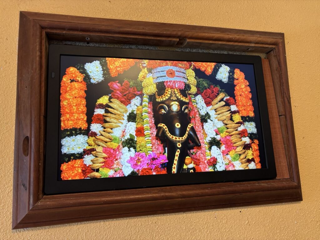 Adjacent to our monastery kitchen is what we call the Kopi Kadai, a small area with beverage facilities and breakfast buffet counter. A couple decades ago we had a painting on the wall, and then shifted to a digital slideshow picture frame once that came on the market. It served us for quite a while until finally the screen lighting died, so we just got a new frame and are adding many photos and paintings to it.