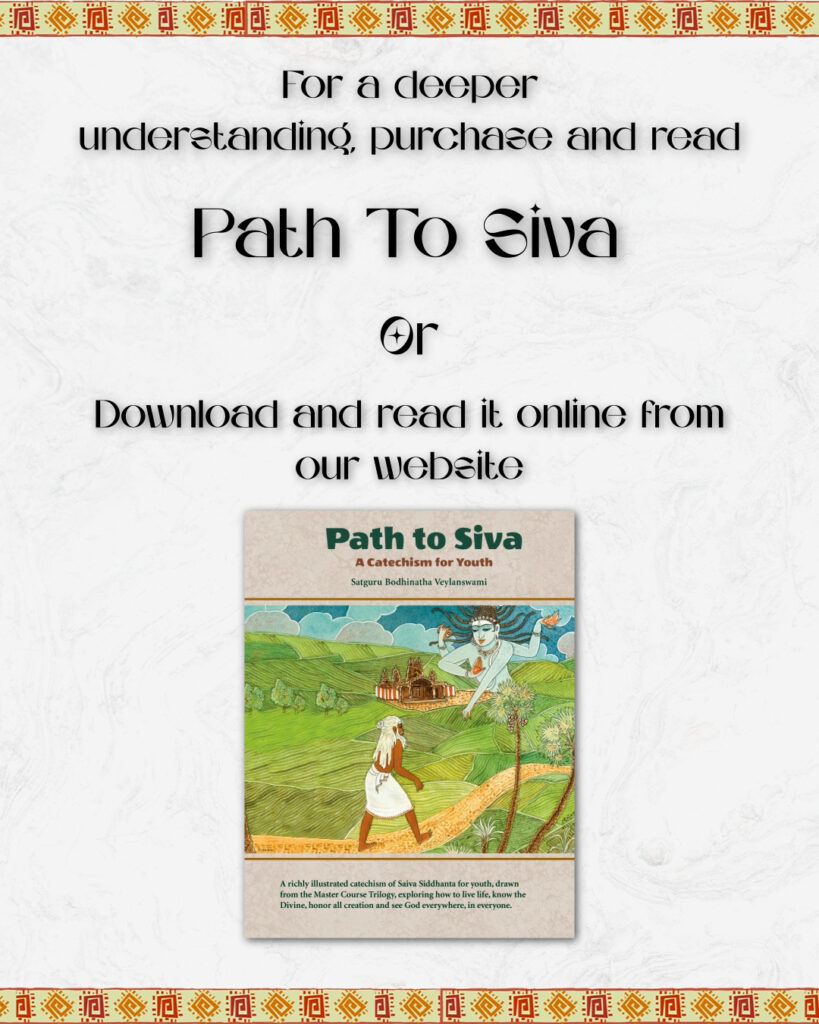 With the Aadheenam’s great many publications that are available to explore and share, we decided to present some here in a different format than usual. The idea was to convert the Path To Siva book into a shorter and simpler version for everyone—as a preview of what the chapter is all about. Something that works well for social media, for example. Below is the short-video format of Chapter 1. Who Am I and Where Did I Come From? Following that are nine slides with simple animations. You can download the video to view it in a better quality by clicking the vertical ellipses in the bottom-right of the video frame. Aum.