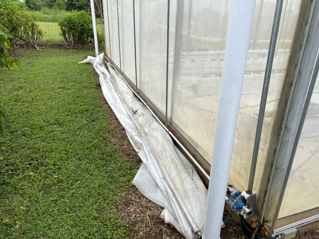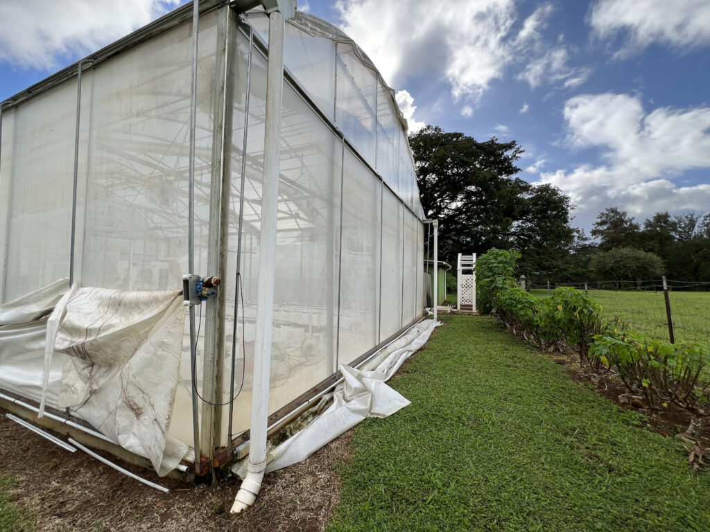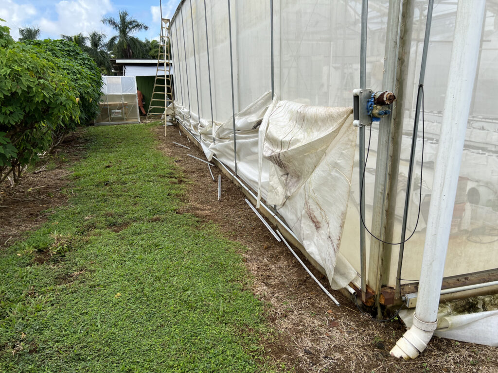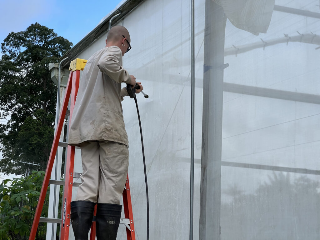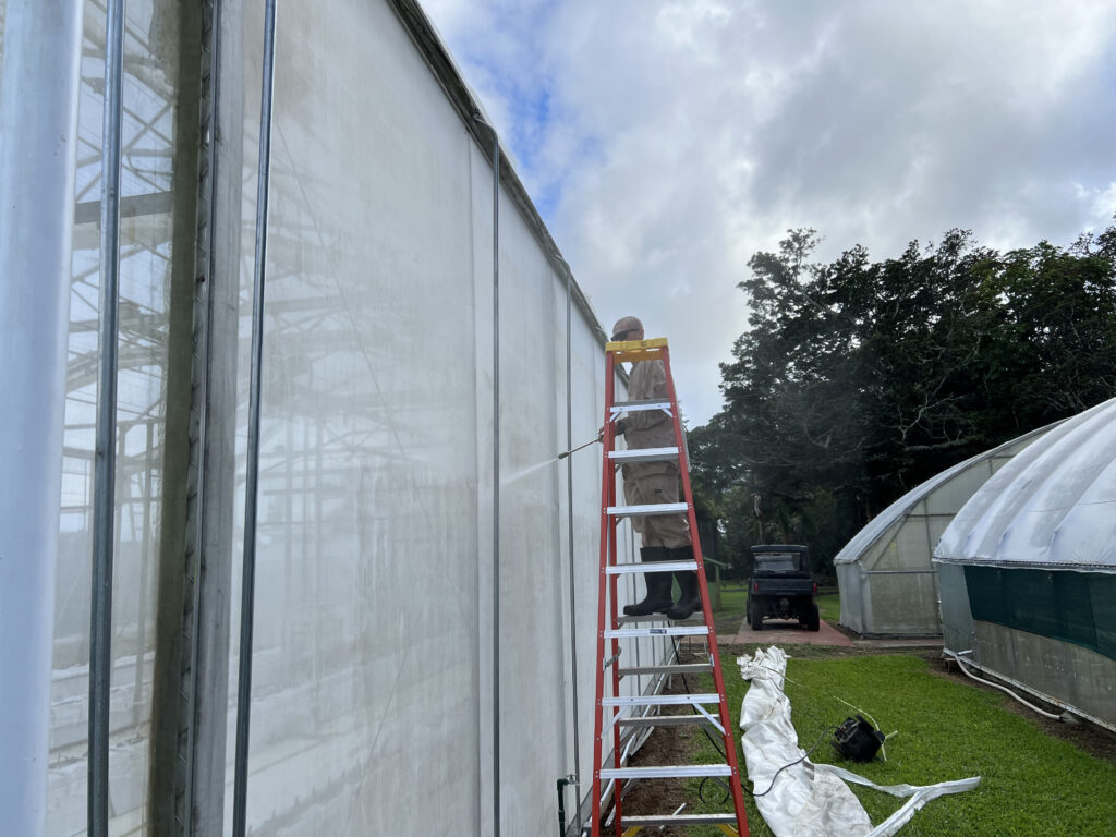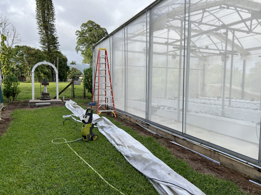 Our monastic greenhouses where created by, and have long been cared for by, the monks of the Siddhidatta Kulam. After many years of Kauai’s weather, the shades are now in need of some deep cleaning and repairs. Due the the strong UV sunlight we have here, the shades had started to deteriorate. This is bad for many reasons, one of the main ones being that the plants are no longer as protected from the sun. These shades automatically go up and down based on the sunlight and heat. If it’s too bright, they lower to protect the fragile plants from the light and if it’s cloudy out, they raise up to offer as much light as possible. The SK Team decided to replace the torn shades with new ones, but in the process discovered that the greenhouse needed to be thoroughly washed. Today they spent the morning pressure washing the greenhouse to make it look like new.