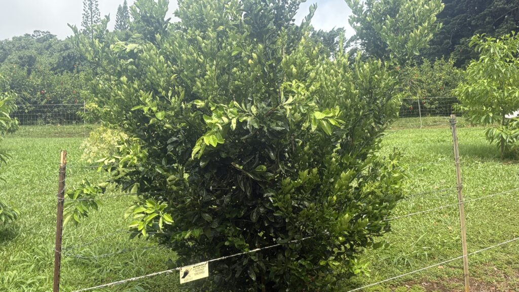 About 70 years back Uncle Manuel (who for decades was the manager of the water system that flows through the land that is now Kauai Aadheenam) received a gift from a Hawaiian clan. They gave him a special orange tree, one whose sweetness and low acidity made it rare and valuable. Manuel carried the tree in a gunny sack on horseback from the mountains about 20 miles to the monastery and planted it himself in a field. There is grew and gave its fruits for all these decades.