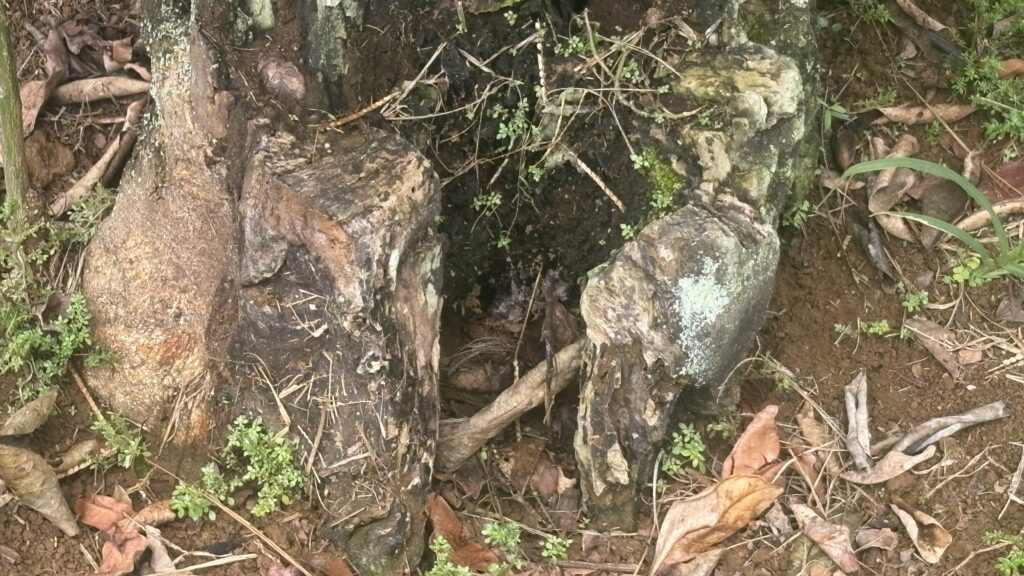 About 15 years back it began to age. The bottom trunk rotted out during a wet winter, then our cows sped up the process by munching on the sweet leaves and fruits. We put a fence around it, but a year later the cows overwhelmed the fence and ate every leaf. We though it was dead.