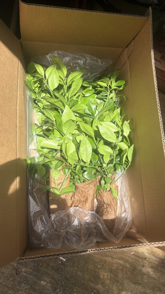 It worked! Yesterday we opened the box with six very healthy orange trees. We will give one to the living relatives of Uncle Manual in honor of his bringing the mother plant to our land, a couple to local botanical gardens and collectors and the rest will be planted in our own fruit groves. Orange trees can live 70-100 years, so a couple of generations of monks will have sweet oranges for breakfast.