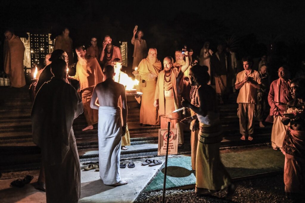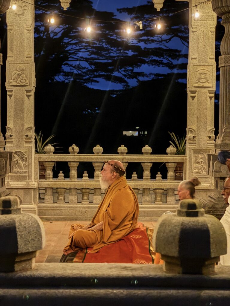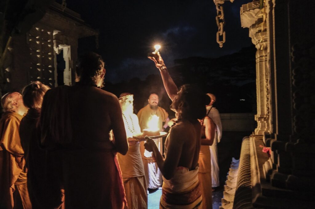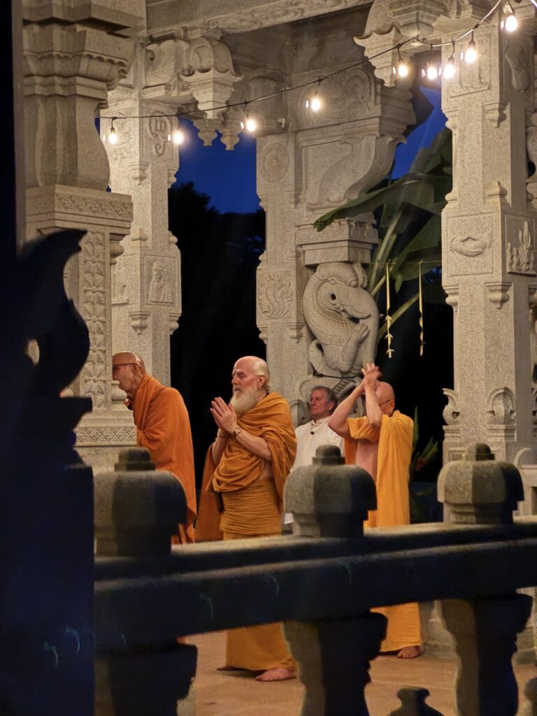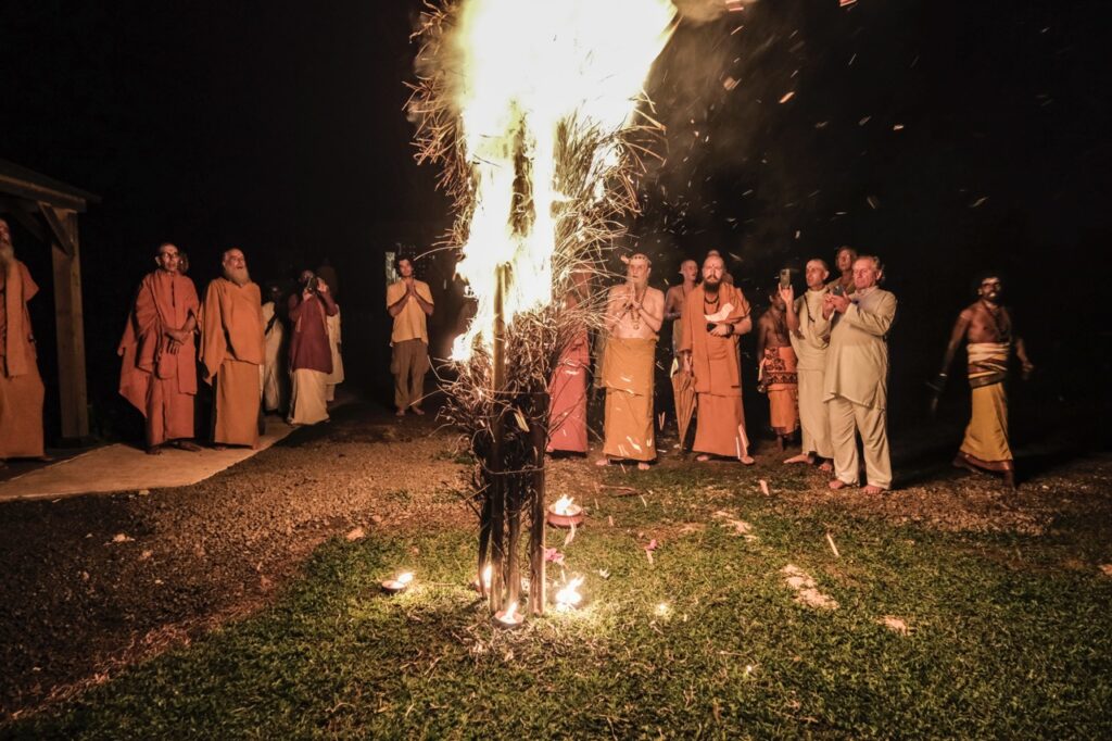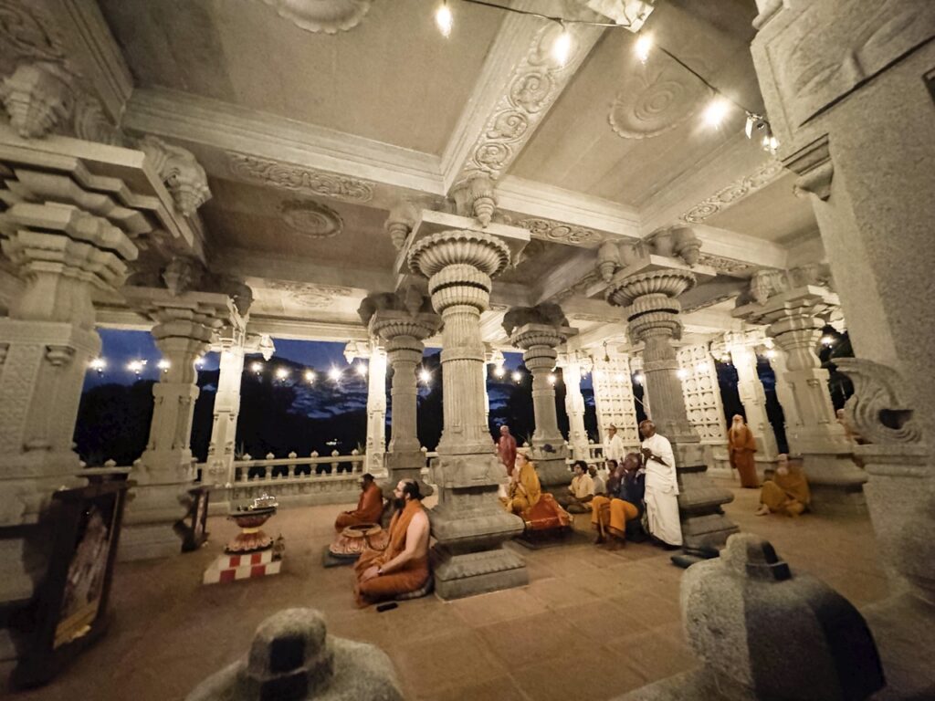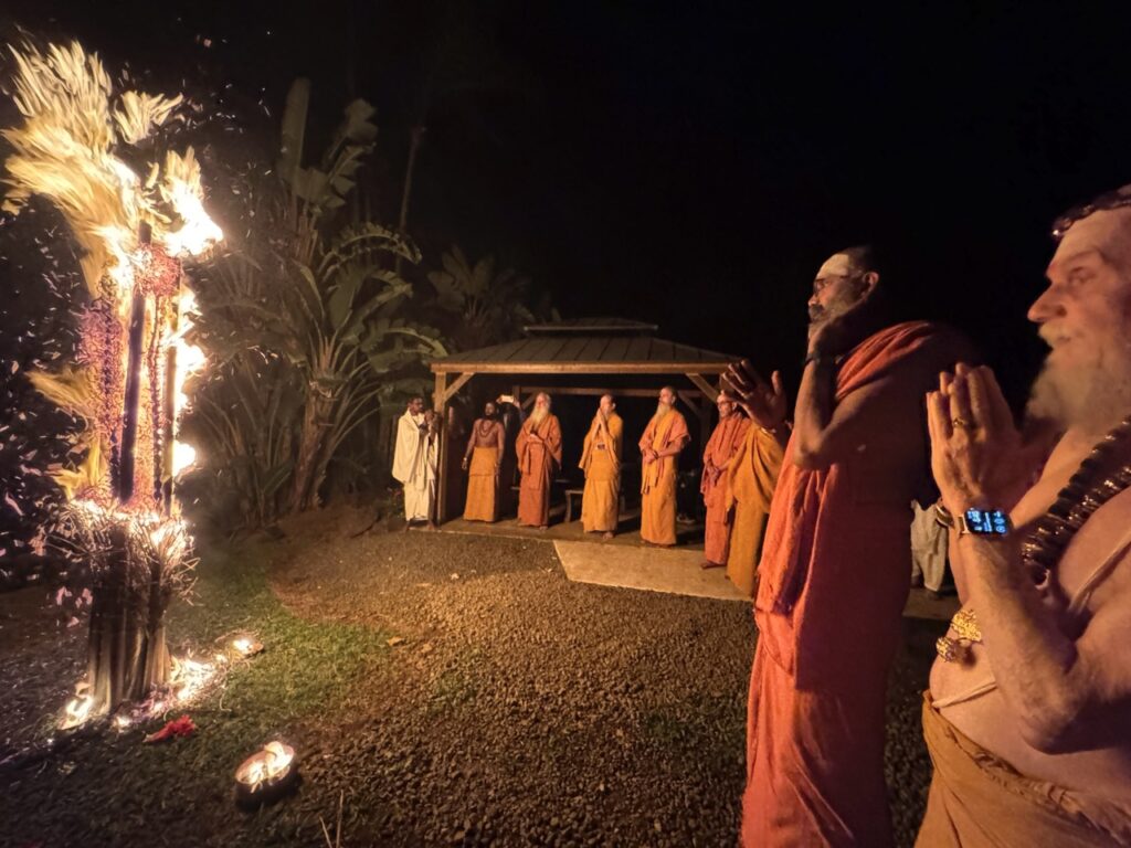 Last night, Iraivan Temple came alive with the radiant celebration of Sivalaya Dipam, a sacred festival honoring Lord Siva as the infinite light of consciousness. This festival commemorates Lord Siva’s boundless nature as an endless pillar of light. Devotees gathered at sunset for the enchanting ceremony. A collection of oil lamps encircled the temple sanctum, casting a serene glow. After a puja to Mahalingesvara, the flame was carried by Satguru out to the front of the temple. The event culminated in the lighting of a grand fire in front of Iraivan, mirroring the traditional hilltop beacon lit at Mount Arunachala in Tamil Nadu.