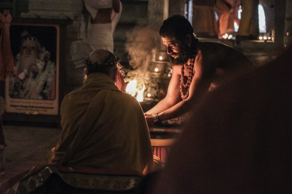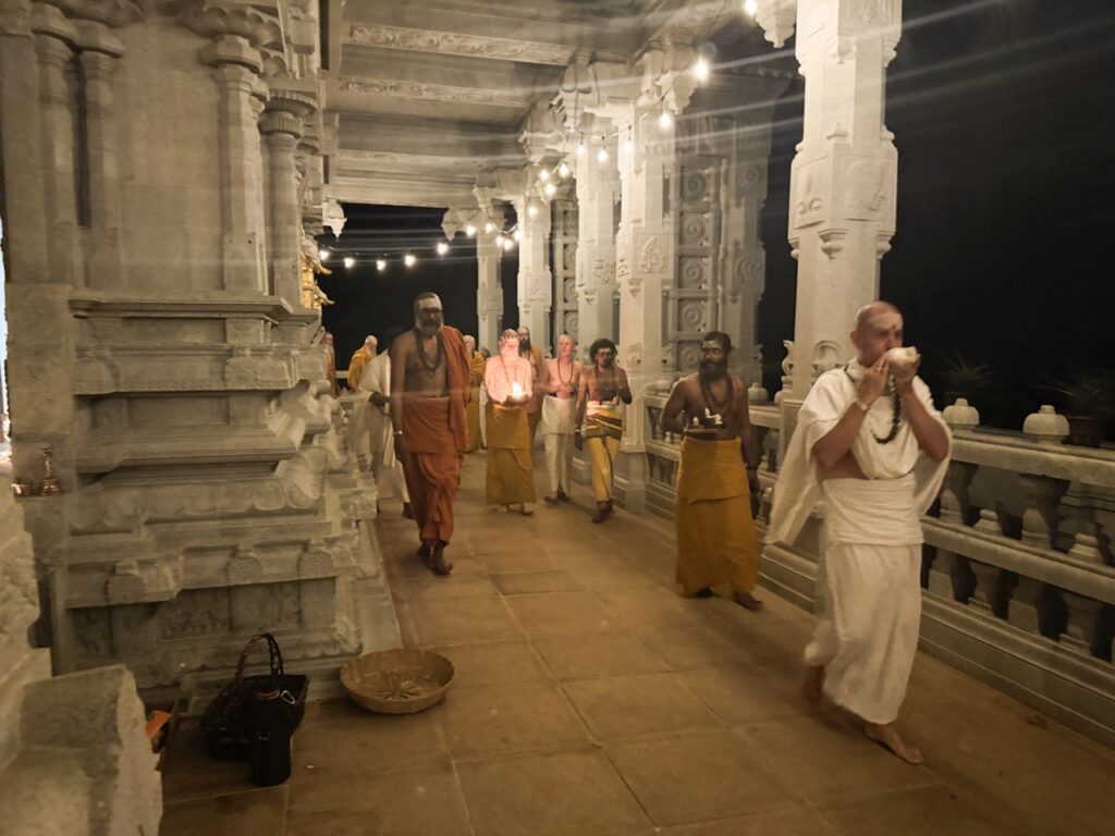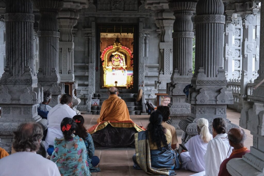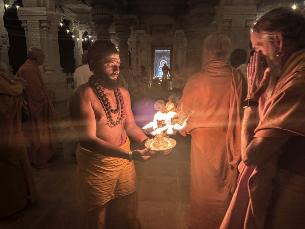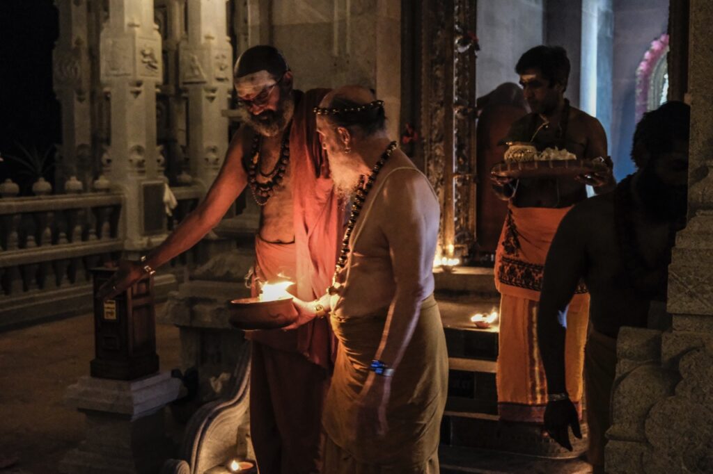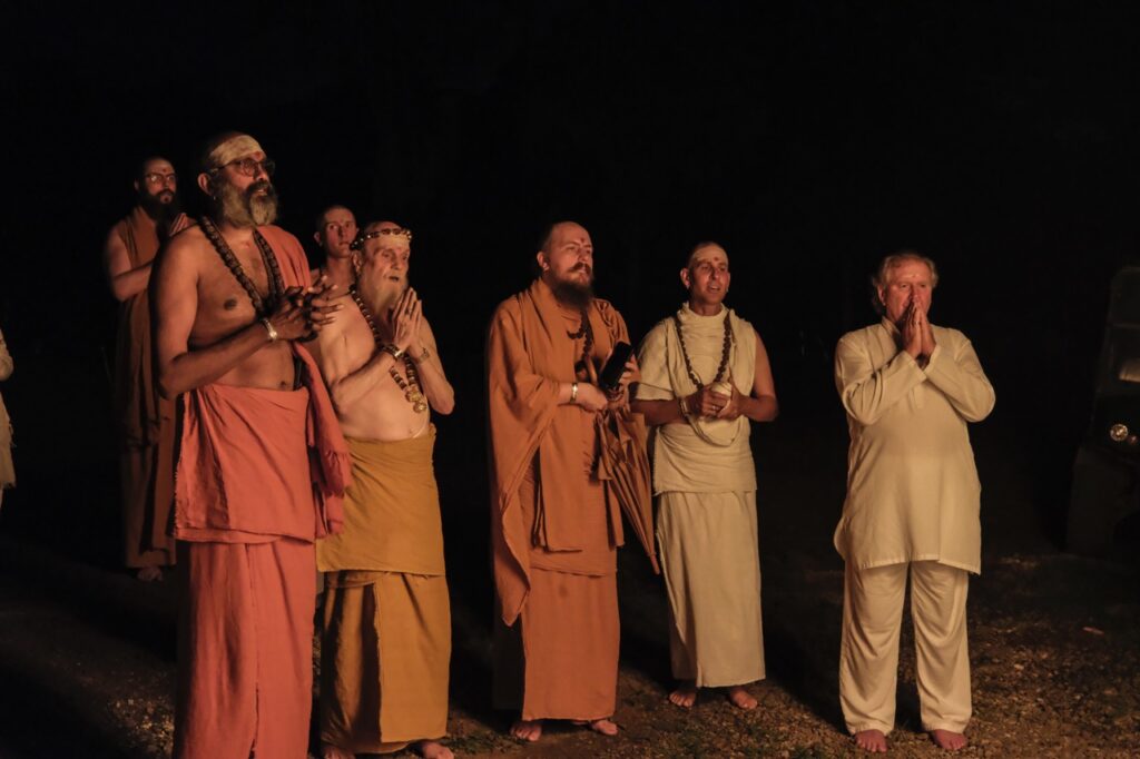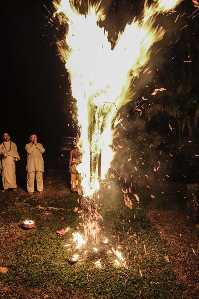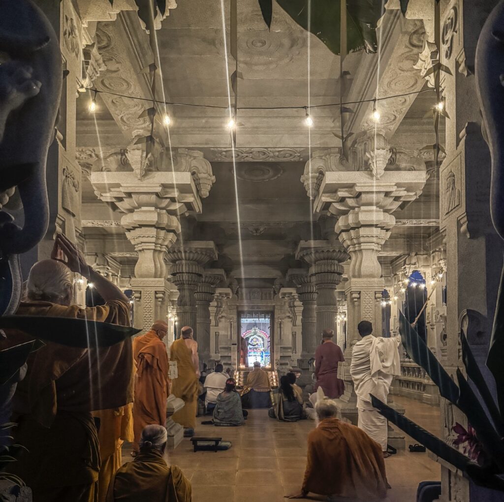 Last night, Iraivan Temple came alive with the radiant celebration of Sivalaya Dipam, a sacred festival honoring Lord Siva as the infinite light of consciousness. This festival commemorates Lord Siva’s boundless nature as an endless pillar of light. Devotees gathered at sunset for the enchanting ceremony. A collection of oil lamps encircled the temple sanctum, casting a serene glow. After a puja to Mahalingesvara, the flame was carried by Satguru out to the front of the temple. The event culminated in the lighting of a grand fire in front of Iraivan, mirroring the traditional hilltop beacon lit at Mount Arunachala in Tamil Nadu.