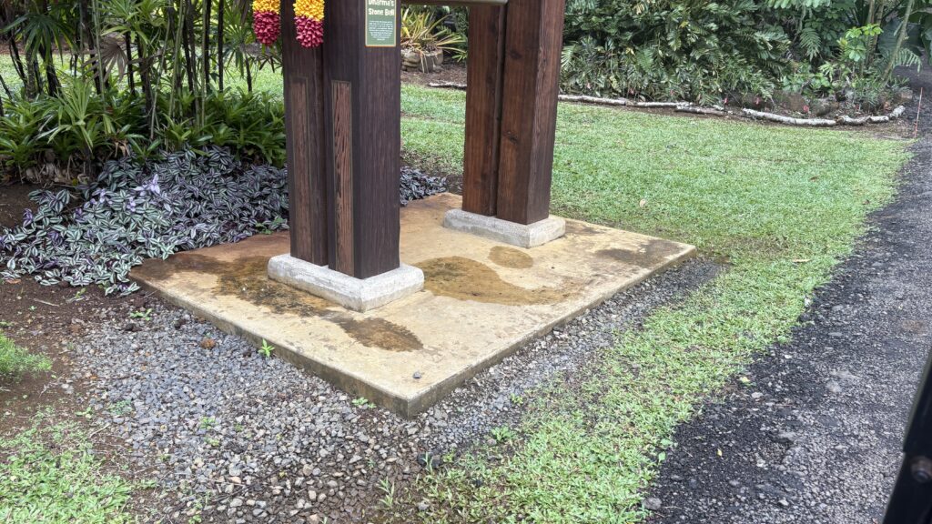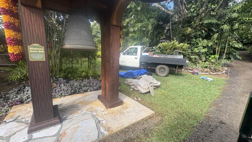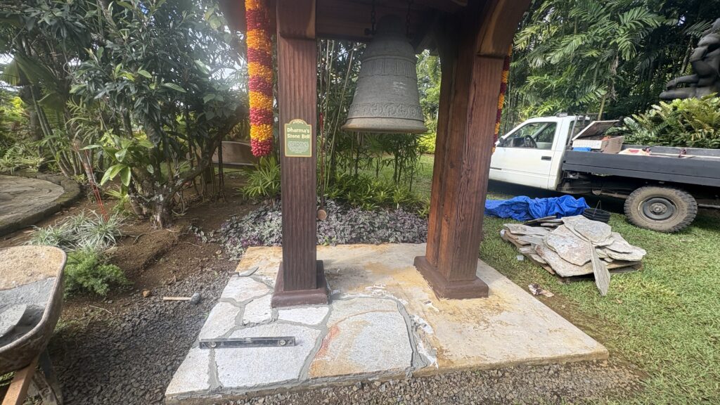 We begin with stone. Today we are installing quartzite from Brazil on the floor of the Stone Bell Tower. It will match the floor of the nearby Silpi Pavilion, which you see in the background in this first photo. Quartzite is a dense kind of stone, which makes it perfect for tropical paths and floors since it does not give a foothold to lichens or molds to grow and it has a slip-proof texture.