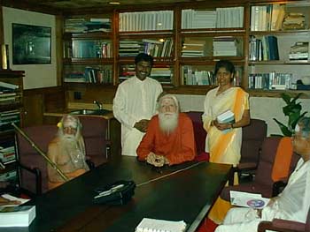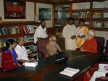 A bright Sri Lankan couple from London, Konesh and Vadivambigai were married just a week ago and came to Hawaii for their honeymoon. They came to the Aadheenam to receive Gurudeva's blessings on their union. Gurudeva instructs the young couple, pointing out in his book "Living with Siva," the chapters on guidelines for a wife, for women, for husbands and for men and for the family. He explains "You must always solve your differences each night before you go to bed. If you don't, if you just ignore them, they will form samskaras, impressions that will remain inside you for years." Then jokingly to Vadivambigai, the bride, he says, "If anything goes wrong, it's all his fault." [pointing to her new husband Konesh, everyone laughs, but then, seriously. . .] "Why? because he has married you and brought you into his home to be with his family and in that context, it is his responsibility to make sure that the situation works and that you will be happy, protected and well taken care of. If that doesn't happen then its his fault." After they left, Gurudeva sat with Meera and Ram Ramamurthy (on the left) Swami Buaji Maharaj, and Sankar Sashtri (on the right but not in the camera.) After a quiet signing of some books. Ram said "Swami Bua, why don't you say something." Swami Bua said, jokingly "I didn't come to give, I came to take!" Then, "I came for a message from Gurudeva." Gurudeva sat quietly for a few minutes of peace in the "beauty of the moment," and then slowly began discussing with the guests the issues of wife abuse and child abuse. In his strong firm way, referring to parents who hit their children and men who hit their wives. . ." Worse than animals! .. . .A problem no one wants to talk about. It's a problem in all communities, but Hindus have the philosophy of ahimsa, which means non-hurtfulness in thought, word or deed." Gurudeva explained about his global campaign against domestic violence and hi-lighted, the success his devotees had in Malaysia and Singapore. "In Malaysia, one of my sishya, a school teacher, became aware of a badly beaten boy... I told him that just by his knowing, he now had a responsibility to report the father to the police. At first he was afraid. Everyone told him it wasn't his place to get involved. But he prevailed and the father is in jail and the boy is in a foster home and he is a hero in his school." There followed an extremely lively discussion on the issue of needing to "discipline children," with occasional comments from the "old school" that still believes in the use of "chastisement. . .some situations require that we instill some fear in our children . . .what if they are going to burn themselves, or if they are so out of control they are disturbing adults in public?" Of course Gurudeva didn't budge an inch. "Cruel heartless people. It's very simple: you don't hurt someone you love, you just can't." Ram, second from the left, concurred "My father never beat me. He was determined that we should never fear him, and he raised us with love." Gurudeva will be going on mission to Mauritius, Malaysia and Singapore in one week and one of the key issues on his agenda is ending domestic violence. The key is education.