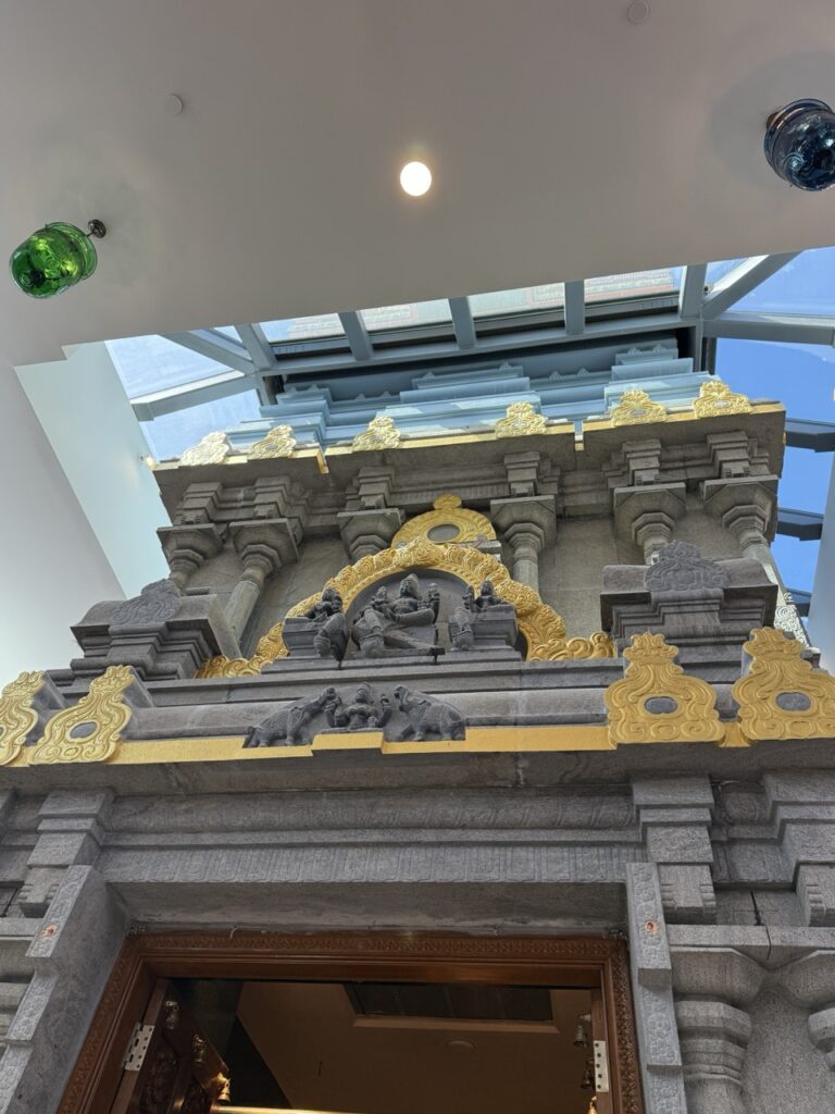 We share Baani’s interpretation today. It depicts a part of his life—seven years of it—spent sitting in a tea shop in Bengaluru. Devotees eventually placed a brass railing around him to keep people from touching the silent and motionless saint. Baani shows how he became revered in the village. She subtly intimates how, at times, something magical happened around him: pieces of paper would fall from above, and on them would be written answers to the thoughts of those present. These became cherished remembrances of their time with him.