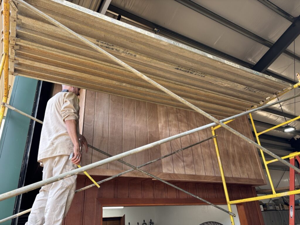For decades we’ve been using “Big Max” small storage sheds to hold many construction, maintenance and repair supplies such as plumbing parts, electrical parts, etc. The sheds served a good purpose, but are inherently flimsy and more susceptible to corrosive elements than a actual building. Now that we have the new Hale Hana metal building, the Siddhidata kulam is gradually moving supplies into secure, better-protected storage space created above the welding station. They are fashioning shelves with unusually-thick plywood that was gifted to us by a local contractor.