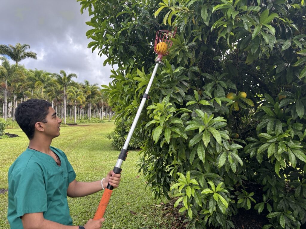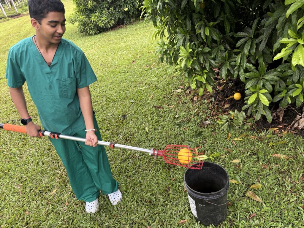 SSC sishyas Erasenthiran and his son Naavalan have arrived from mainland USA for a month to serve in the Siddhidata Kulam at Kauai Aadheenam during Naavalan’s summer break from school. In today’s photos, Naavalan is picking Abiu fruit that is abundantly in season right now. He says he enjoys being out in nature, with the cooling trade wind breeze and birds chirping.