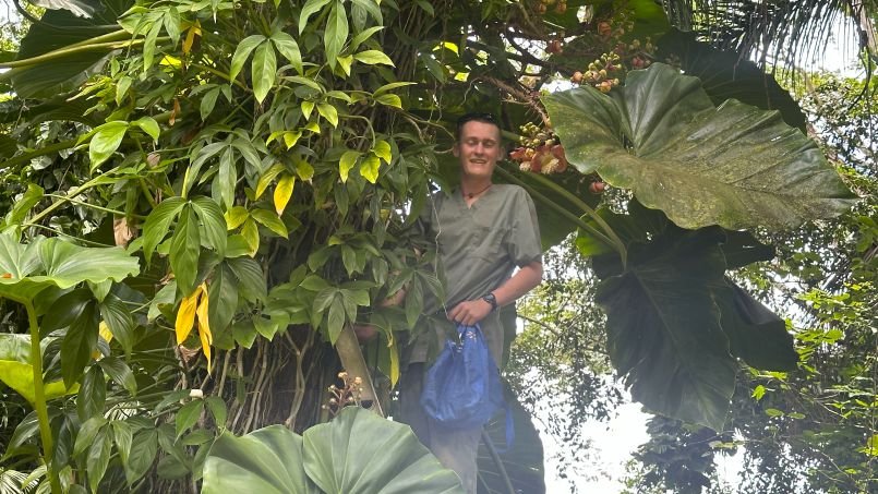 Some 40 years back we planted two Naga Pu trees from India and they grew in the shade of some tall Poincianna trees, so did not flower as expected. This year they did flower and here we see Sadhaka Shankaranatha harvesting the flowers. Commonly called the Cannon Ball Tree after its spherical brown fruit that can be the size of a human head, it is known in India as Naga Pu or Serpent Flower. As the slideshow reveals, the intricate structure of the flower holds a structure that looks like a cobra’s hood hovering above a yellow circle which has in the middle a tiny white Sivalingam. The tree is planted in temple compounds throughout India and the flowers are a special offering to Siva. Sadhaka took his bag of blossoms to Siva’s Feet.