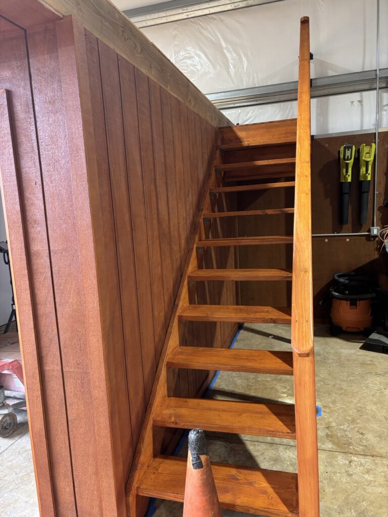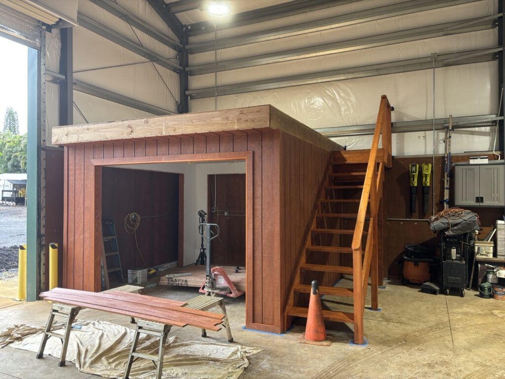 For decades our welding tasks temporarily took over spaces dedicated to other needs, which wasn’t ideal. Now with the new Hale Hana metal building, the Siddhidata Kulam is able to dedicate a protected space just for welding, including storage for the equipment. The framing and outside walls are done; now the inside walls, ceiling and wiring are being intalled and covered up. To make the most of space, a staircase was built alongside so that the roof can be used for general storage.