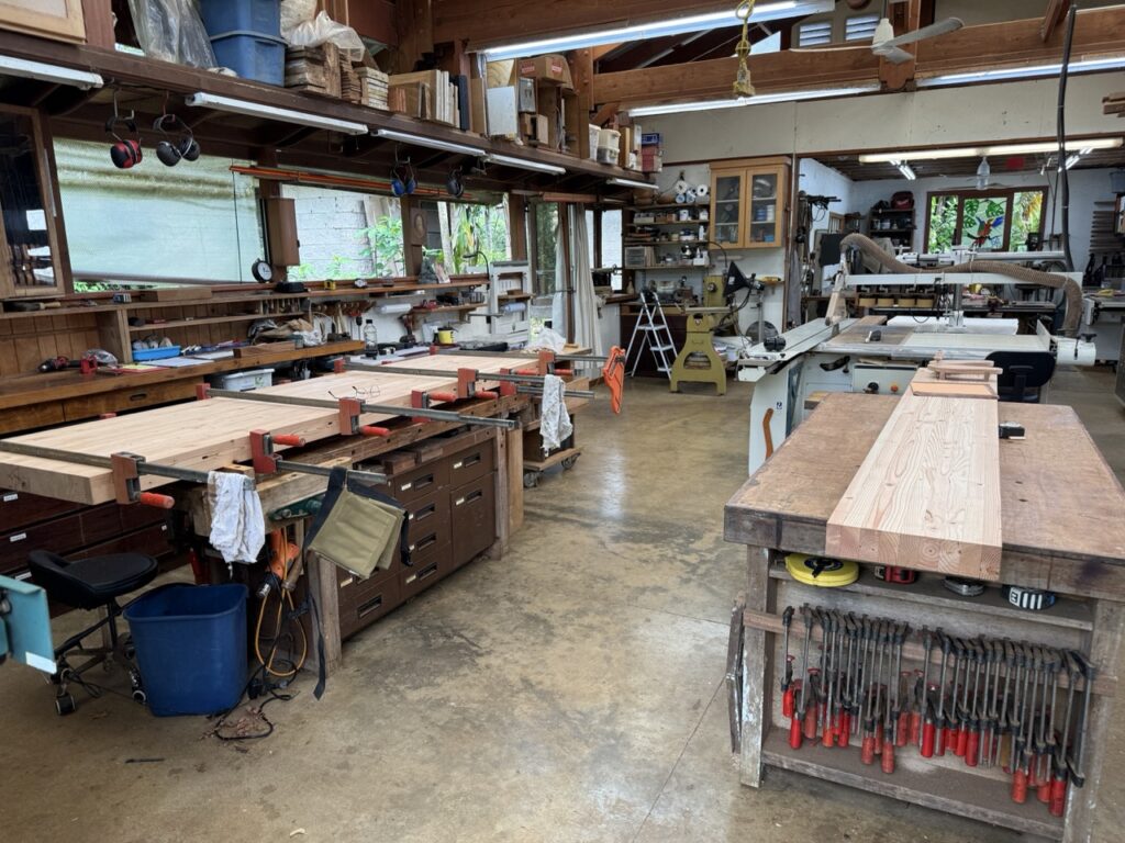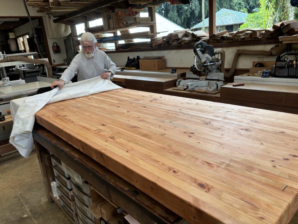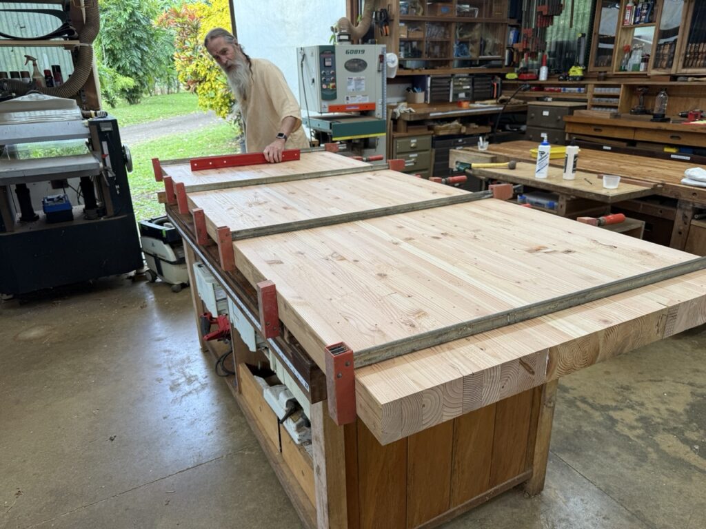 Kanda Alahan from California is here to serve for a couple weeks in his expert woodworking capacities. His main task will be to install replacement kitchen island cabinetry in about a week that he had crafted back home. Before then, he and Kumarnathaswami are creating a new workbench for the tented area adjacent to the main woodshop. They’re making use of three glulam beams that we had left over from another project. They planed and sanded to make sure the beams are the exact same dimensions, then glued them together to form the wide workbench. Finally, a simple finish coat was applied.
